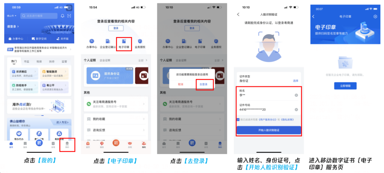 1.经办人须刷脸登录粤商通APP,在【我的】-【电子印章】中将数字证书安装好,并生成包括个人章在内的三个印章;