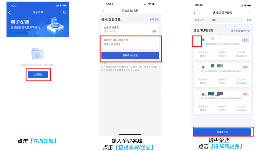 搜索并选择需领取移动数字证书(电子印章)的企业。