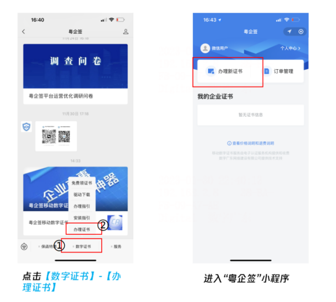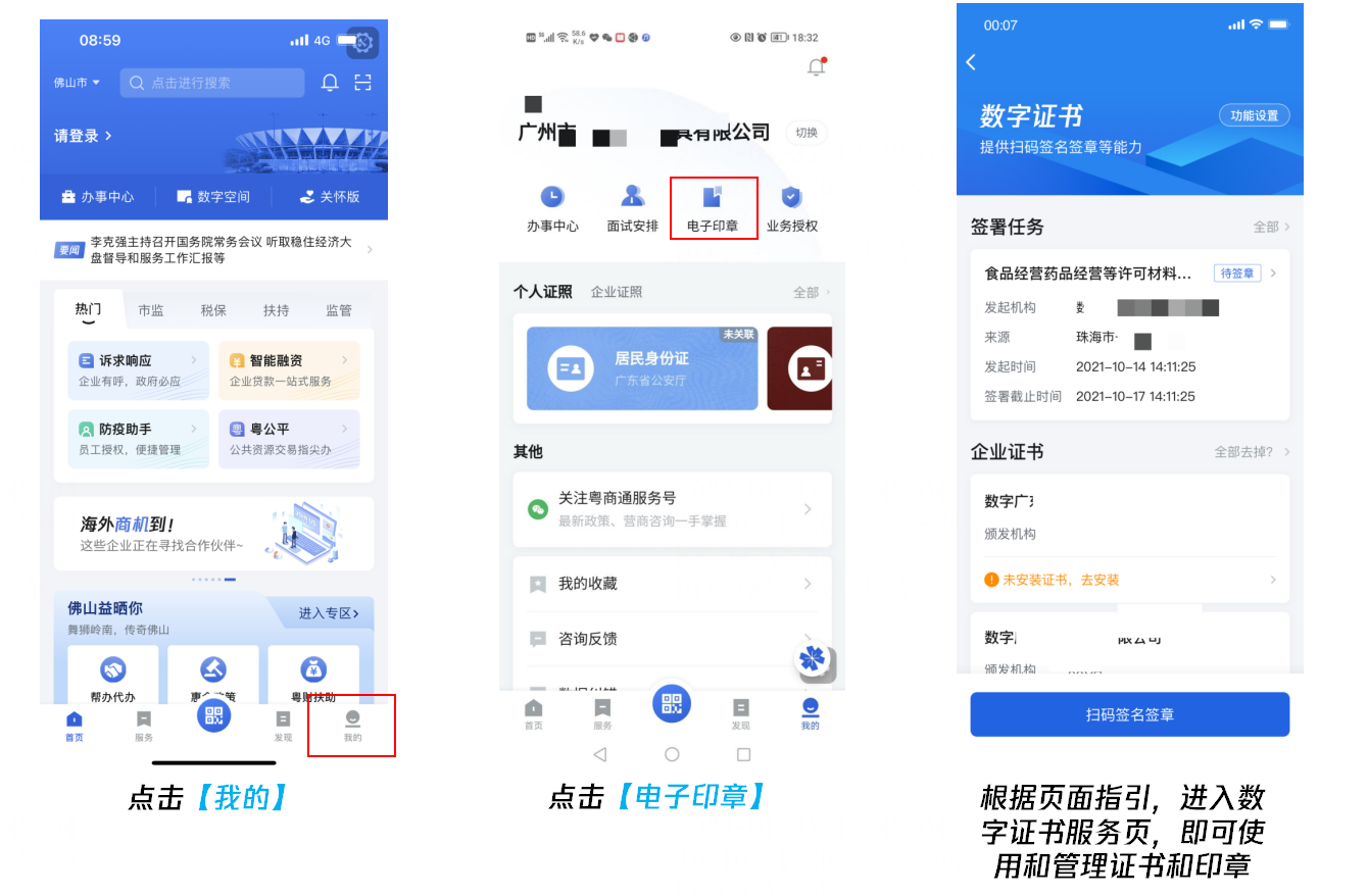 2、办理成功后,用户需前往粤商通APP安装、使用、管理证书和印章。