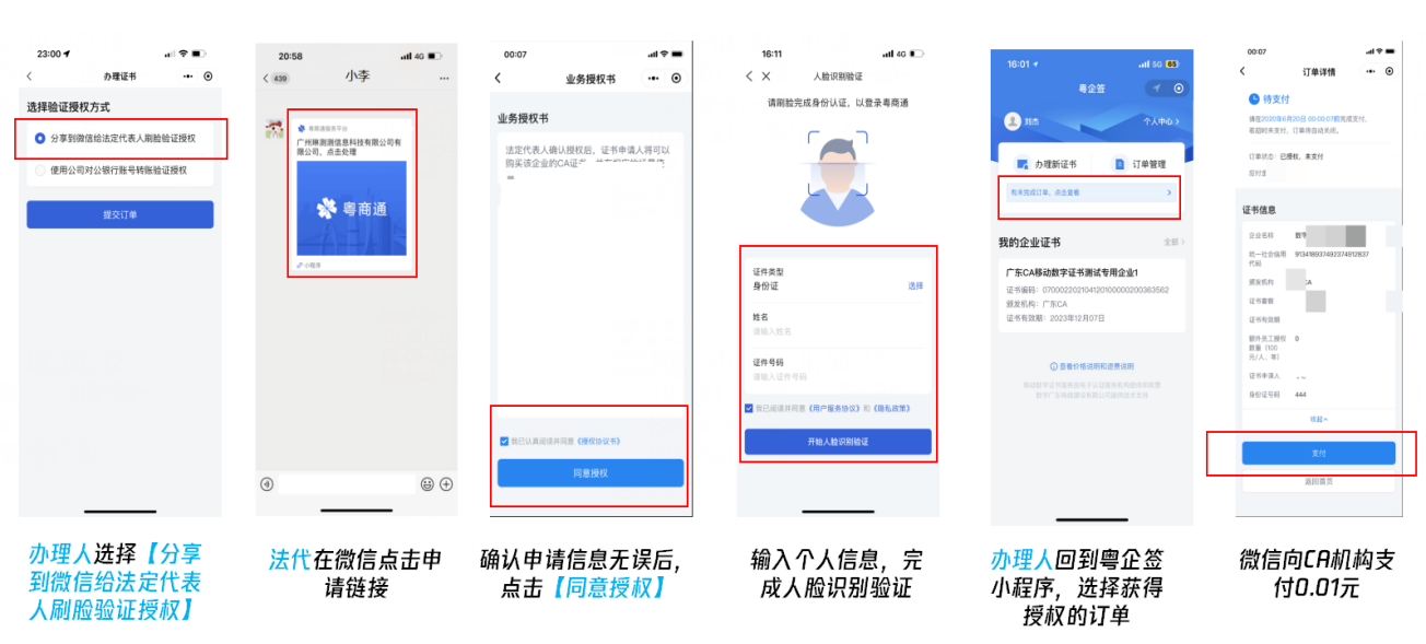 在粤企签小程序办理证书(印章),办理人可通过“法定代表人人脸识别验证”或“对公银行账号转账验证”完成企业认证。