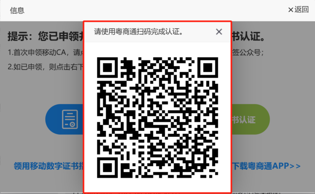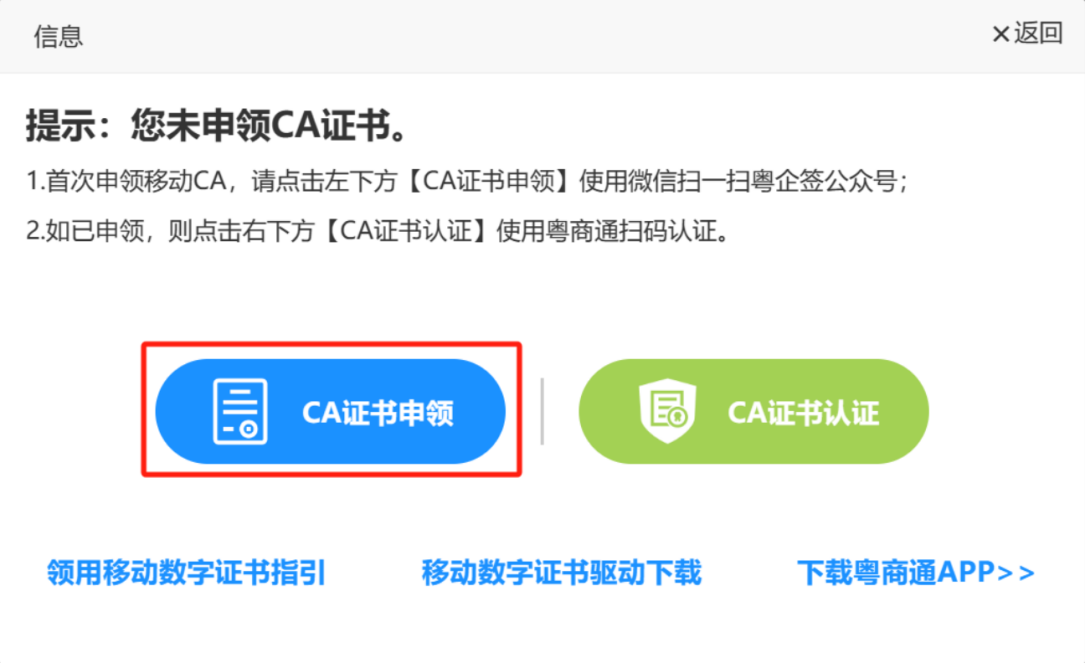 如已申领,则点击右下方【CA证书认证】使用粤商通扫码认证。